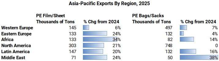 Several states in the US have enacted bans on single-use PE bags. Similar bans are in place in the EU, as well as other countries. However – excluding Asia-Pacific – every world region imported higher volumes of both product groups. Asia-Pacific was the leading regional exporter, noting, especially, shipments from China, Vietnam, India, and Thailand.