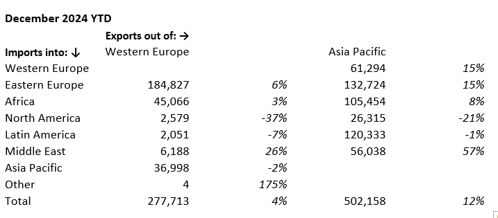 Western Europe and Asia-Pacific are the world’s largest exporting regions for general purpose polystyrene. Western Europe’s exports are mainly to Eastern Europe (noting Poland and Turkey) and Africa. Asia-Pacific ships to numerous markets in Western and Eastern Europe, Africa, Latin America, and the Middle East (noting Turkey, Egypt, South Africa, Mexico, UAE). Asia-Pacific’s exports to Latin America are projected down slightly for the year.